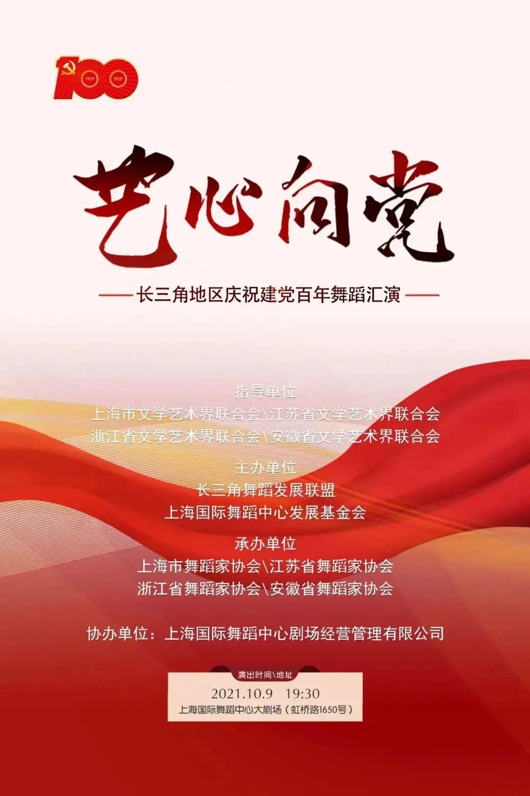10月9日晚,由长三角舞蹈发展联盟、上海国际舞蹈发展基金会主办的“艺心向党——长三角地区庆祝建党百年舞蹈汇演”在上海国际舞蹈中心大剧场精彩上演。今年会的原创舞蹈作品《雨花石的等待》、《承艺·热巴》有幸受邀参加了此次舞蹈汇演。本次汇演由沪、苏、浙、皖四地文学艺术界联合会联合指导,长三角舞蹈发展...