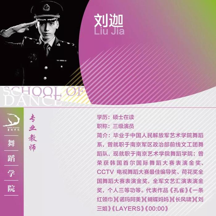 刘迦老师自2018年入职南艺舞院以来,多次参加校内外演出活动,先后参加了国家艺术基金资助项目大型舞剧《刘三姐》、江苏省艺术基金资助项目舞蹈诗剧《节气江南》的排演工作,均担纲主演。