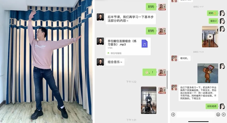 于嘉奇老师在指导员工学习古典芭蕾基本功的过程中,通过自身的动作示范,以网络视频的方式对员工进行教授与指导,并将其所教授的每一个训练组合的“训练意义”、“动作要求”,以Word文档的形式呈现给员工,使员工能够“知其然”更能“知其所以然”,充分发挥了在线教学的优势。此外,于老师以文字和图片的形式,发送给员工与芭蕾相关的史论知识及世界著名芭蕾舞团的演出视频,使员工对古典芭蕾基本功训练有了更为全面的认知与理解。