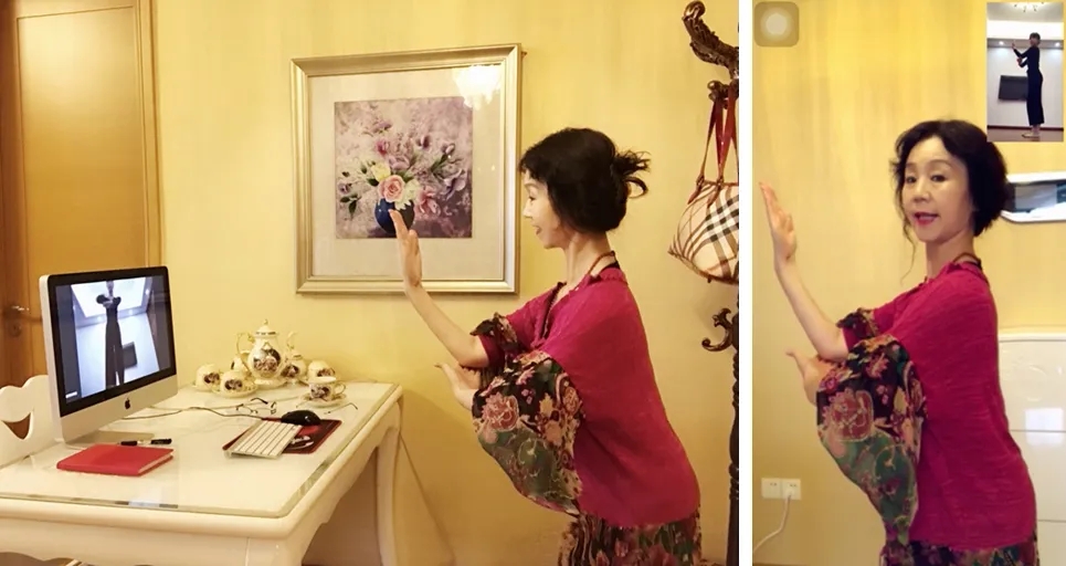 中国古典舞基本功训练中的舞姿学习是十分重要的,它贯穿于每一个训练组合之中。施萌老师要求班上员工以线下拍摄照片的方式来进行多个舞姿的呈现。员工使用智能手机拍摄照片,并通过网络社交软件发送给任课老师,老师再根据员工线上反馈的照片,通过网络视频的方式给予动作上的明确指导,使员工对于每个舞姿的学习都有了更进一步的提高。